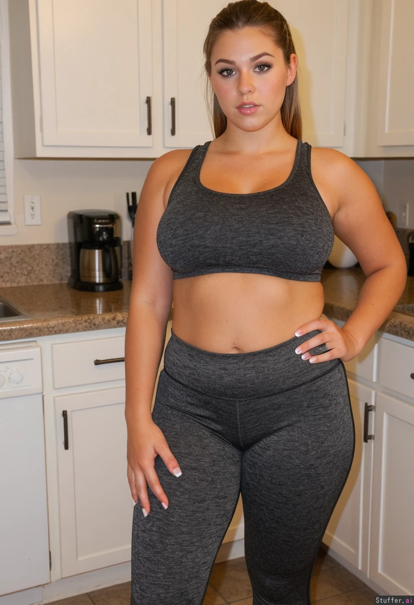 21 year old tan athletic Mormon yo girl, model face, wearing tight gym clothes, standing in kitchen, Plump lips Tight belly Massive tits Pussy_peek Tits