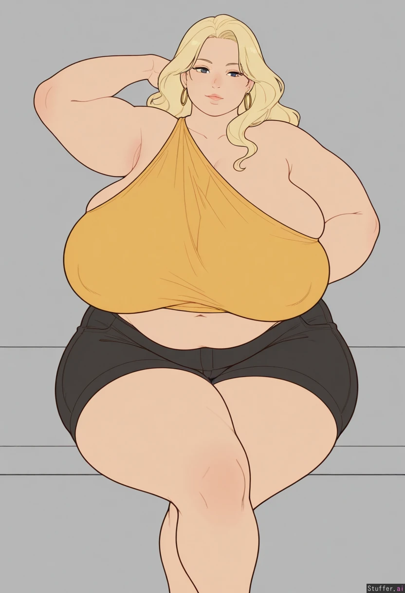 (gigantic_breasts:1.3), sagging_breasts, massive_thighs, morbidly_obese_female, wife, crossed_legs, ((fine_outlines, flat_colors)), long_breasts, (fat_arms:1.3), hoop_earrings, wide_hips, wide_thighs, long_blonde_hair, one strap top, black shorts, thigh_squish