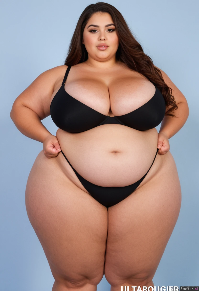 Long wavy brown hair (View from side) (((((Giant wide thick enormous rotund thighs))))) ((((Standing outside)))) (((Thick fat plump expanding Waist))) (((((Black thong pressed into skin))))) ((Black bra cleavage)) (((((Curvy oversized cleavage))))) (((((Bulging ultra_wide massive hips))))) (((((Thick curvy full hips))))) (((((Growing: heavier, thicker, fatter:1.8))))) (((((Full fat belly:))))), ((((gigantic fat belly:1.6))))
