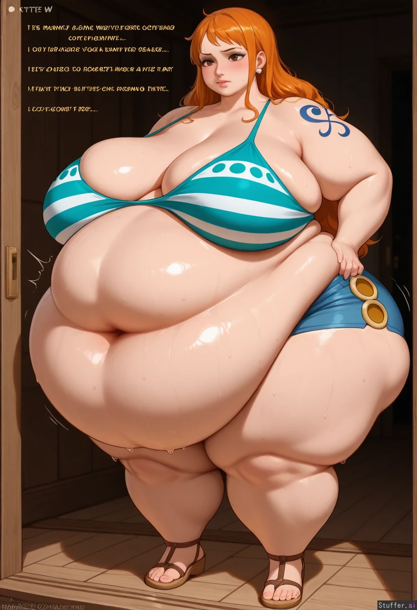 High resolution, solo, ((best quality), (high rating), absurd res, high res, detailed, ultra quality, ((high quality)), masterpiece, (ultra high resolution), stunning beauty, detailed face, intricate detail, sophisticated detail, exquisite detail, perfect 2D art, realistic lighting, realistic shading, correct anatomy, 8k, (highly detailed face), highly detailed skin texture, ((anime)), (solo)), ((kittew (artist))), ((Nami (one piece), orange hair)), ((hyper obese, incredibly fat, overweight, ussbbw, weight gain, feedee)), ((absurdly bellyheavy)), (((hyper obese, morbidly obese, absurdly fat, soft fat, fat rolls))), gigantic thick soft thighs, (((soft belly, flabby belly, soft fat, sagging belly, gigantic obese belly))), (((very fat arms, double belly, huge belly, massive hyper belly, belly overhang, sagging soft belly, massive gut, lovehandles, belly rolls))), ((fat legs)), embarrassed, blushing, skindentation, wide hips, (heavy breasts, huge breasts, sagging breasts), from bottom to top, (bellyheavy). (cellulite, fat rolls, dimpled thighs, skindentation), full body, (one deep low navel), weight gain, ((sweaty))