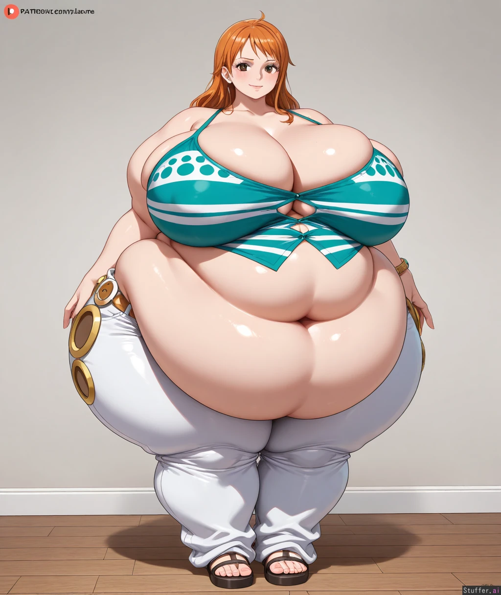High resolution, solo, ((best quality), (high rating), absurd res, high res, detailed, ultra quality, ((high quality)), masterpiece, (ultra high resolution), stunning beauty, detailed face, intricate detail, sophisticated detail, exquisite detail, perfect 2D art, realistic lighting, realistic shading, correct anatomy, 8k, (highly detailed face), highly detailed skin texture, ((anime)), (solo)), ((Nami (One piece), tight clothes, clothes bursting)), chubby, hyper curvy, obese, (massive breasts, enormous sagging breasts, cleavage, saggy boobs, absurdly huge heavy breasts, hyper breasts, huge sagging boobs, absurdly busty), (((big belly, fat rolls, huge belly, hyper belly, very fat belly, enormous belly, belly overhang, flabby belly, obese belly))), full body view, incredibly wide hips, top heavy, huge soft thighs, (hyper wide hips)