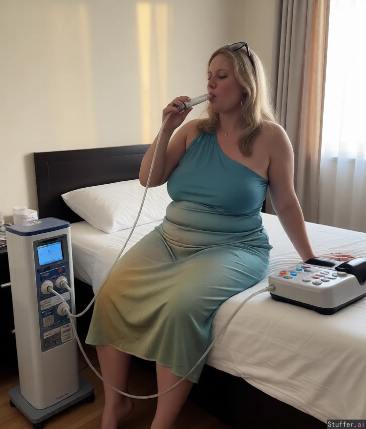 Have her sitting on a bed drinking from a tube connected to a weight gain machine Weight_gain chubby_woman