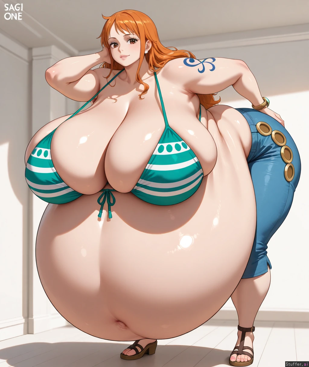 High resolution, solo, ((best quality), (high rating), absurd res, high res, detailed, ultra quality, ((high quality)), masterpiece, (ultra high resolution), stunning beauty, detailed face, intricate detail, sophisticated detail, exquisite detail, perfect 2D art, realistic lighting, realistic shading, correct anatomy, 8k, (highly detailed face), highly detailed skin texture, ((anime)), (solo)), ((Nami (One piece), tight clothes, clothes bursting, bikini, milf)), chubby, hyper curvy, obese, (hyper fat, very fat, morbidly obese), (massive breasts, enormous sagging breasts, cleavage, saggy boobs, absurdly huge heavy breasts, hyper breasts, huge sagging boobs, absurdly busty), (((big belly, fat rolls, huge belly, hyper belly, very fat belly, enormous belly, double belly, belly overhang, flabby belly, hanging belly, sagging belly, obese belly))), full body view, top heavy, belly heavy