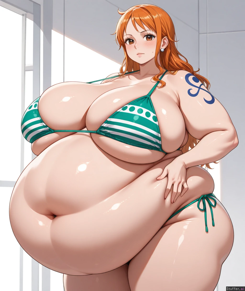 High resolution, solo, ((best quality), (high rating), absurd res, high res, detailed, ultra quality, ((high quality)), masterpiece, (ultra high resolution), stunning beauty, detailed face, intricate detail, sophisticated detail, exquisite detail, perfect 2D art, realistic lighting, realistic shading, correct anatomy, 8k, (highly detailed face), highly detailed skin texture, ((anime)), (solo)), ((Nami (One piece), bikini)), chubby, hyper curvy, obese, (hyper fat, very fat, flabby, fat rolls, heavy hanging flab, morbidly obese), (massive breasts,, busty), (((big belly, huge belly, fat rolls, huge belly, hyper belly, very fat belly, enormous belly, double belly, belly overhang, flabby belly, obese belly))), top heavy, (((bellyheavy, SSBBW, bbw)))