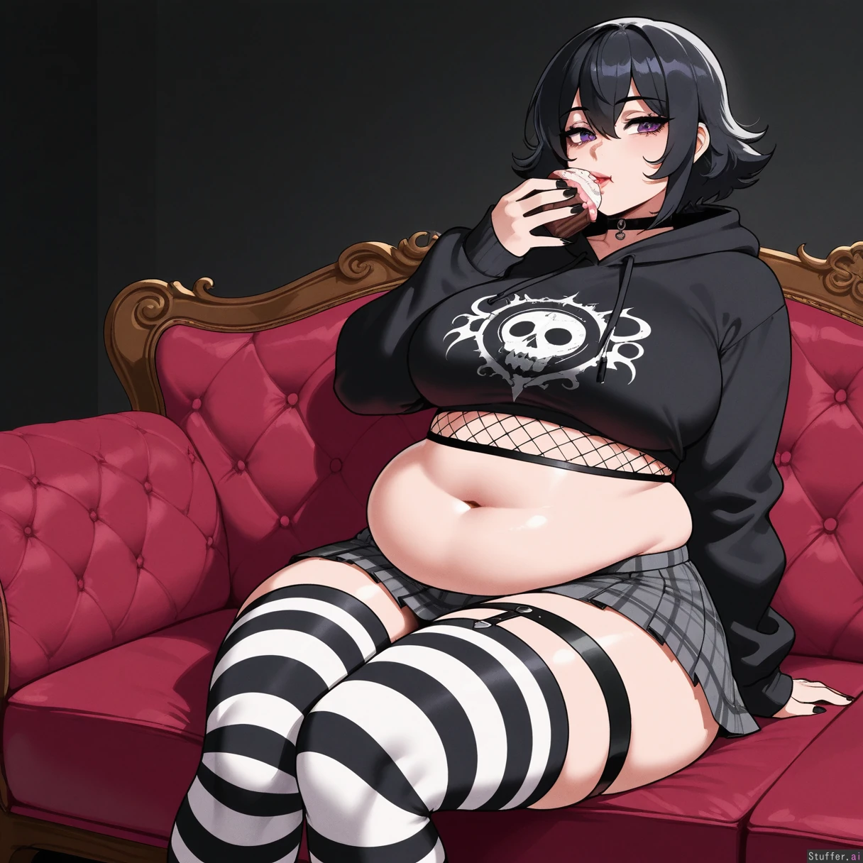 Masterpiece, best_quality, beautiful, vibrant colors, dim light, (1girl), nyantcha(artist), goth, short hair, black hair, purple eyes, choker, fishnet midriff, black hoodie top, grey plaid skirt,black and white striped thigh highs, sitting on couch, eating cupcake, (overweight:1.5)