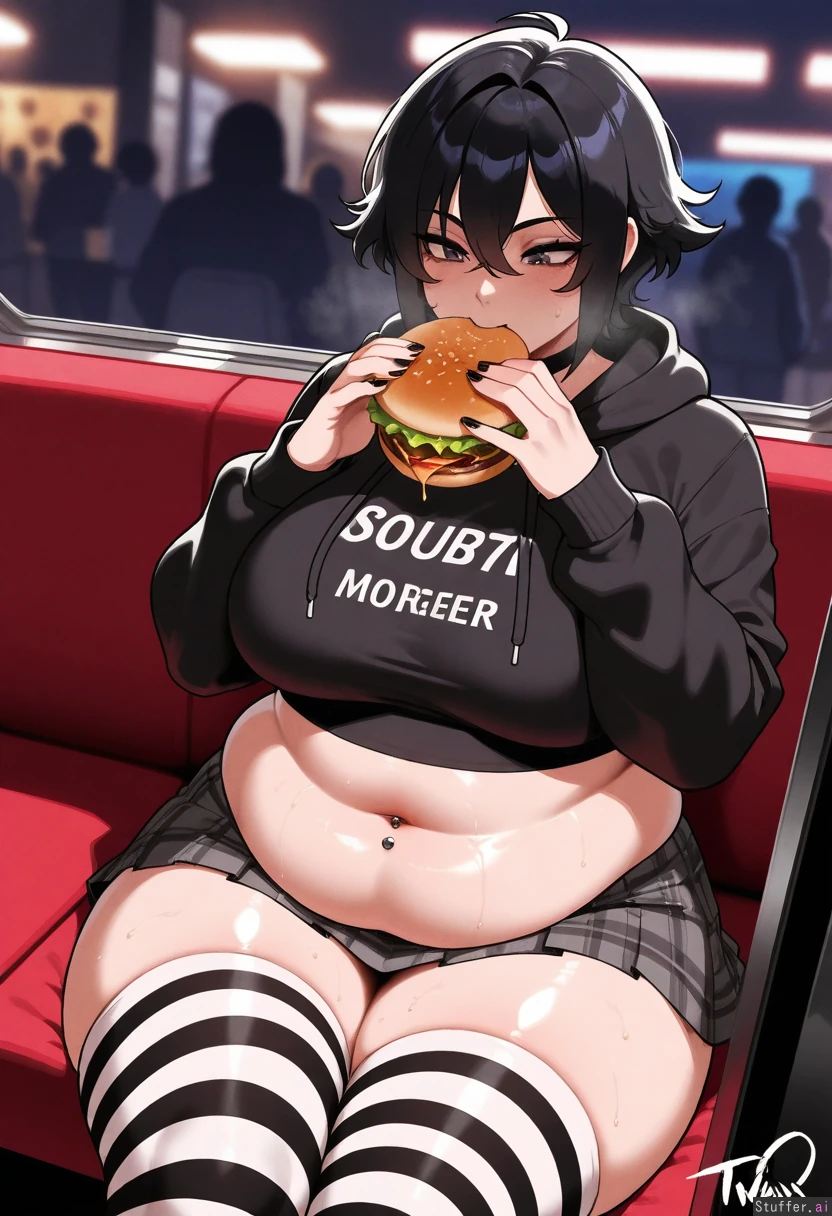 Masterpiece, best_quality, beautiful, vibrant colors, dim light, (1girl), nyantcha(artist), goth, short hair, black hair, purple eyes, black lipstick, choker, midriff, black hoodie top, navel piercing, tight grey plaid skirt, tight black and white striped thigh highs, eating burger, fat face, flabby belly, flabby thighs, sweating, panting, out of breath, sitting in McDonalds, (obese:1.5)