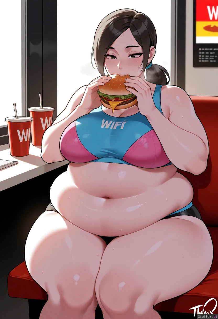 Masterpiece, best_quality, beautiful, vibrant colors, dim light, (1girl), nyantcha(artist), Wii fit trainer, eating burger, fat face, flabby belly, flabby thighs, sweating, panting, out of breath, sitting in McDonalds, pink bra, (obese:1.5)