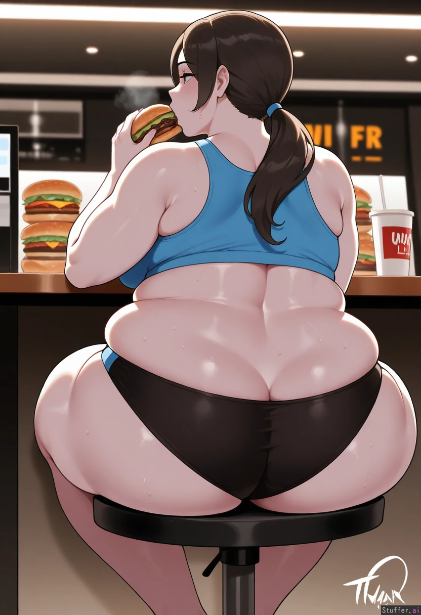 Masterpiece, best_quality, beautiful, vibrant colors, dim light, (1girl), nyantcha(artist), Wii fit trainer, white skin, eating burger, fat face, flabby belly, flabby thighs, sweating, panting, out of breath, sitting in McDonalds, embarassed, back view, skindentation, panties, (obese:1.5)