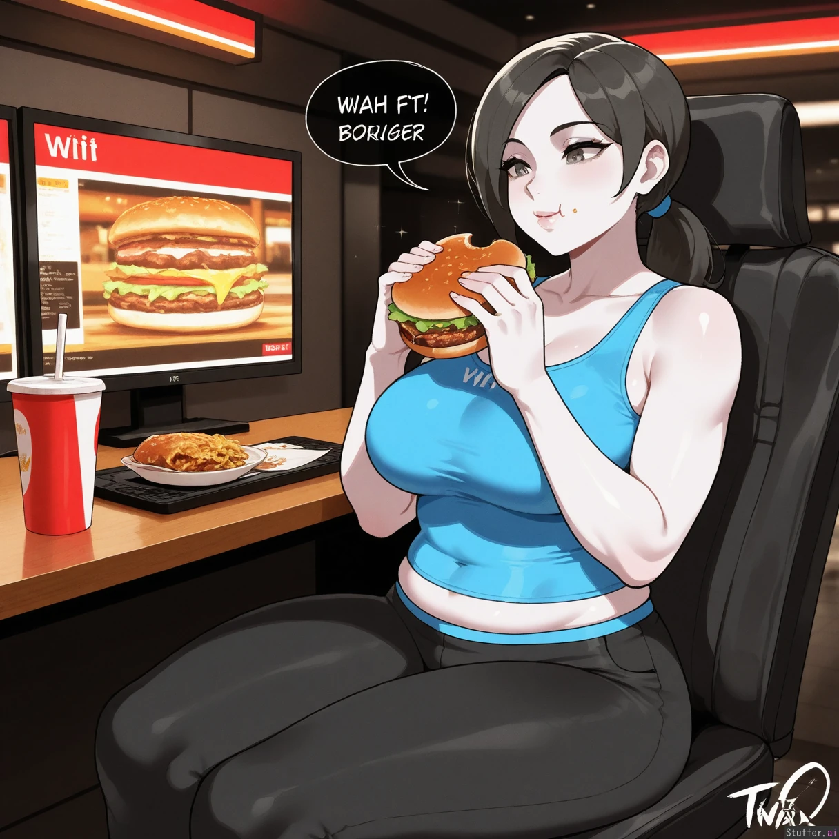 Masterpiece, best_quality, beautiful, vibrant colors, dim light, (1girl), nyantcha(artist), Wii fit trainer, white skin, eating burger, sitting in McDonalds, (overweight:1.0)