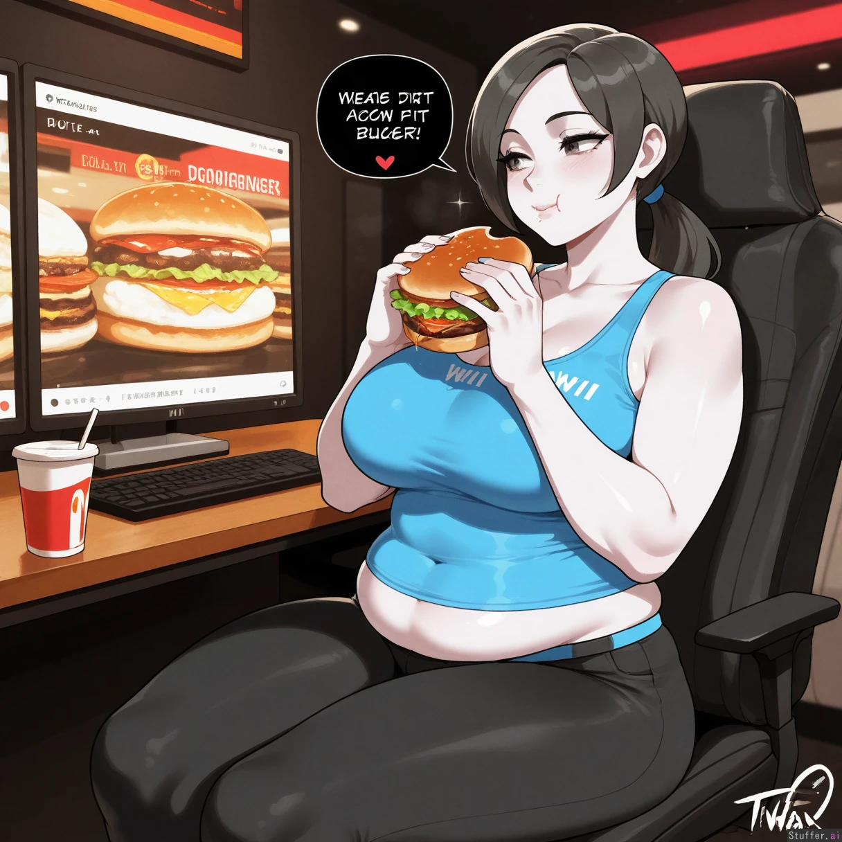 Masterpiece, best_quality, beautiful, vibrant colors, dim light, (1girl), nyantcha(artist), Wii fit trainer, white skin, eating burger, sitting in McDonalds, (overweight:1.2)