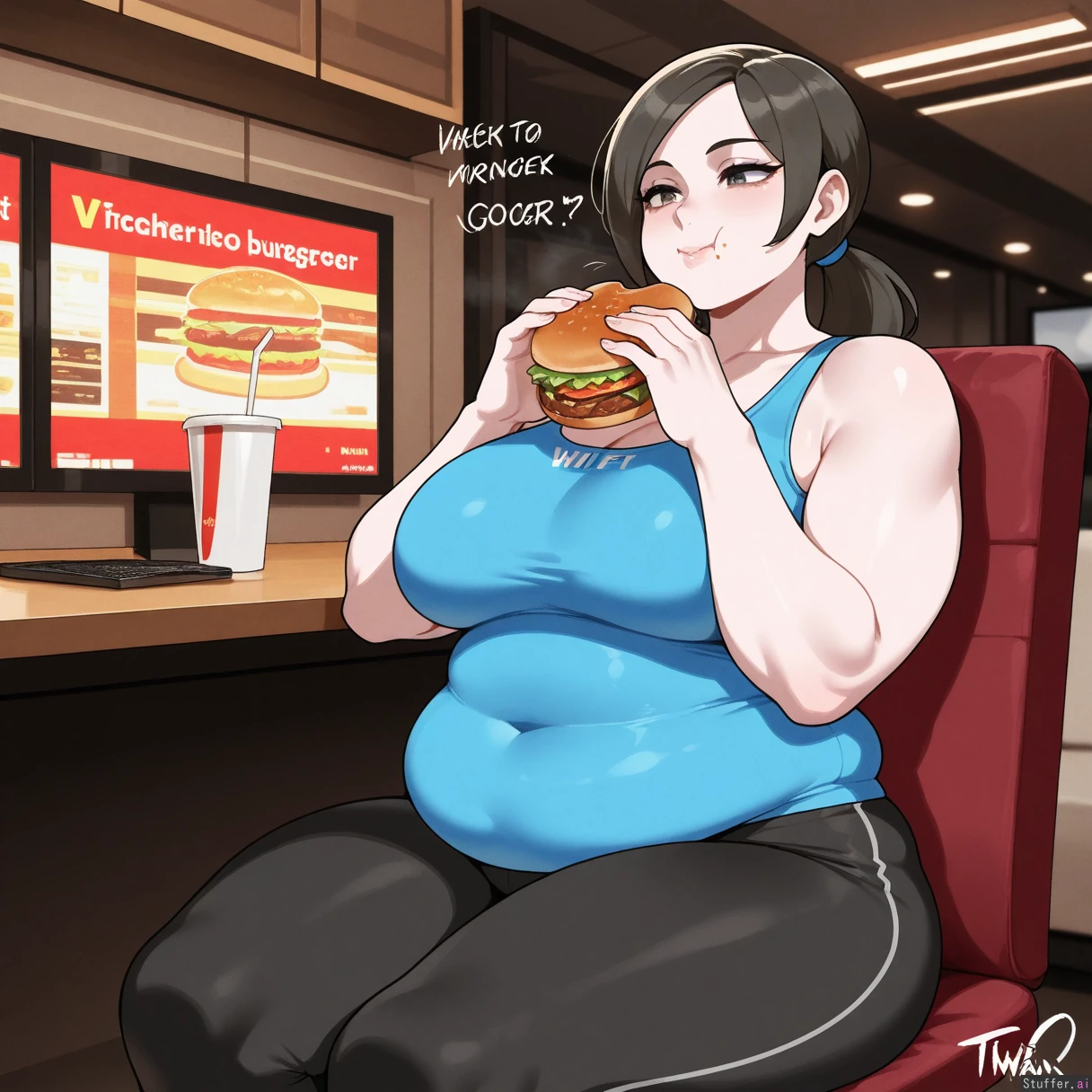 Masterpiece, best_quality, beautiful, vibrant colors, dim light, (1girl), nyantcha(artist), Wii fit trainer, white skin, eating burger, sitting in McDonalds, tight clothing, (overweight:1.5)