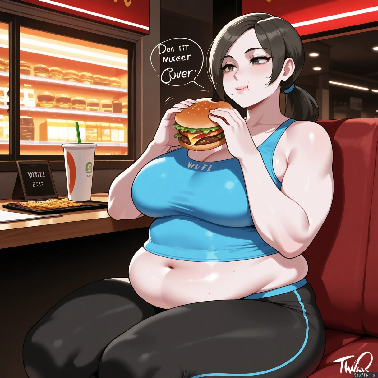 Masterpiece, best_quality, beautiful, vibrant colors, dim light, (1girl), nyantcha(artist), Wii fit trainer, white skin, eating burger, sitting in McDonalds, skindentation, (overweight:1.6)