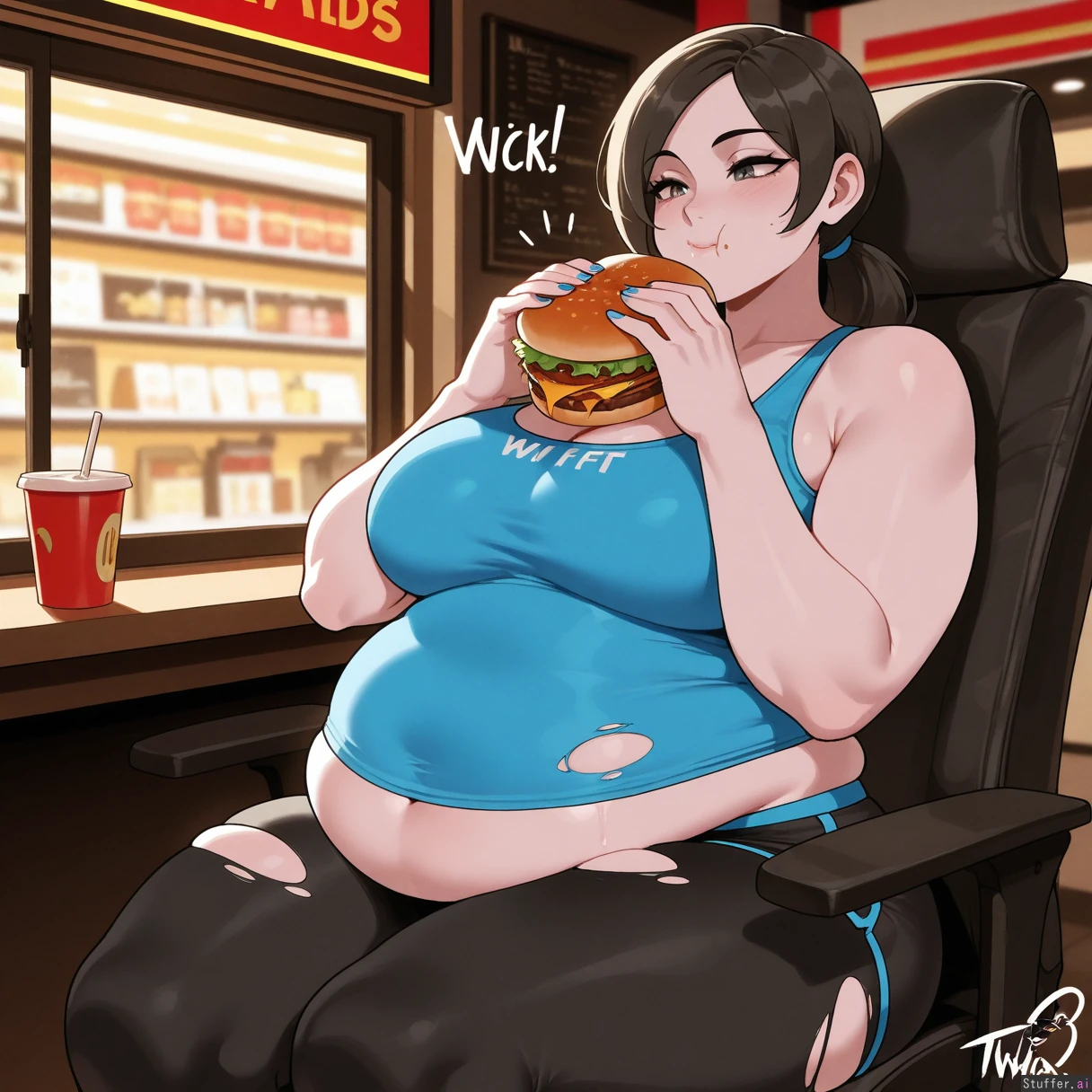 Masterpiece, best_quality, beautiful, vibrant colors, dim light, (1girl), nyantcha(artist), Wii fit trainer, white skin, eating burger, sitting in McDonalds, skindentation, (torn clothing:0.75) (overweight:1.7)