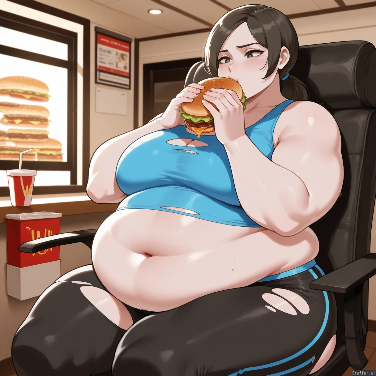 Masterpiece, best_quality, beautiful, vibrant colors, dim light, (1girl), nyantcha(artist), Wii fit trainer, white skin, eating burger, sitting in McDonalds, skindentation, (torn clothing:1.5), (overweight:2.0)