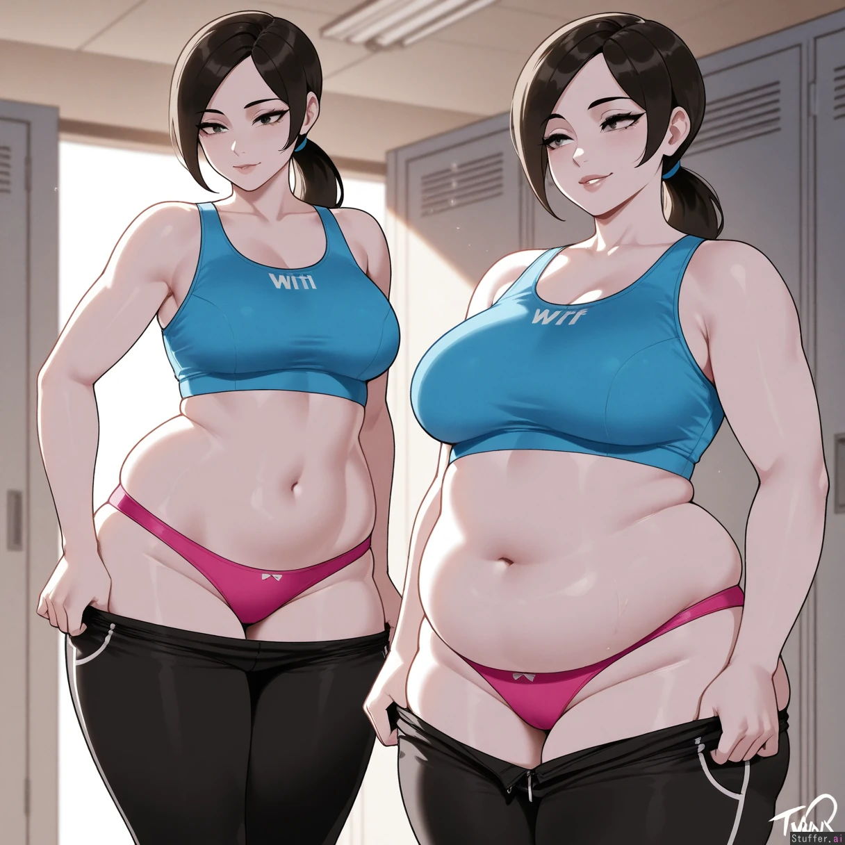 Masterpiece, best_quality, beautiful, vibrant colors, dim light, (1girl), nyantcha(artist), Wii fit trainer, white skin, locker room, pulling up pants, pink panties, skindentation, (overweight:1.5)