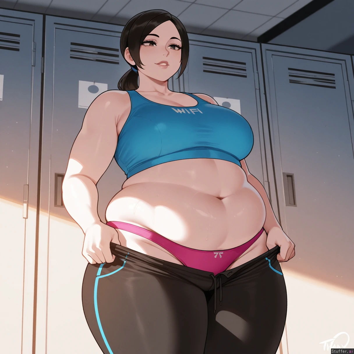 Masterpiece, best_quality, beautiful, vibrant colors, dim light, (1girl), nyantcha(artist), Wii fit trainer, white skin, locker room, pulling up pants, pink panties, skindentation, (torn clothing:0.75), (overweight:1.7)