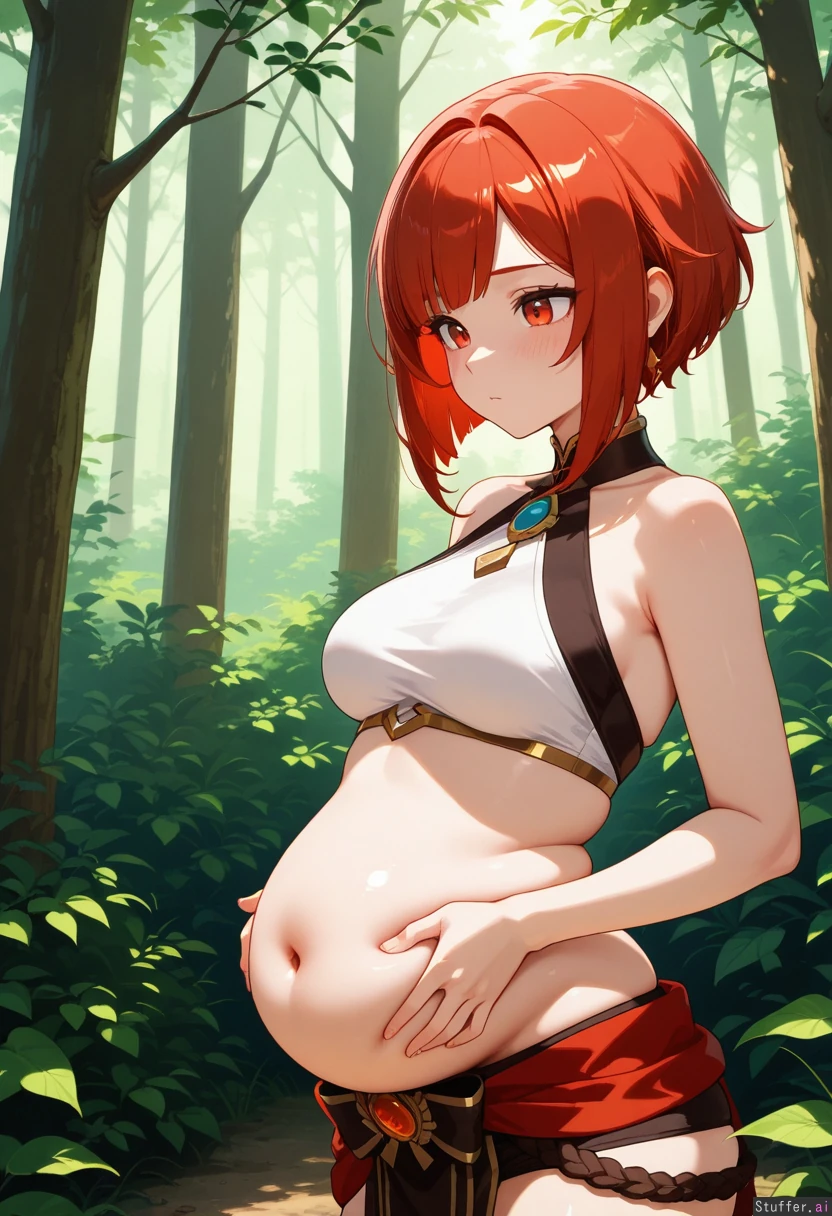 Genshin impact artstyle, Solo, girl, red_hair, bob_hairstyle, light red_eyes, blushing, Slim, medium breasts, Standing near blueberry bush, in forest, daytime, detailed_background chubby_belly belly_rest belly_rolls soft_belly muffin_top