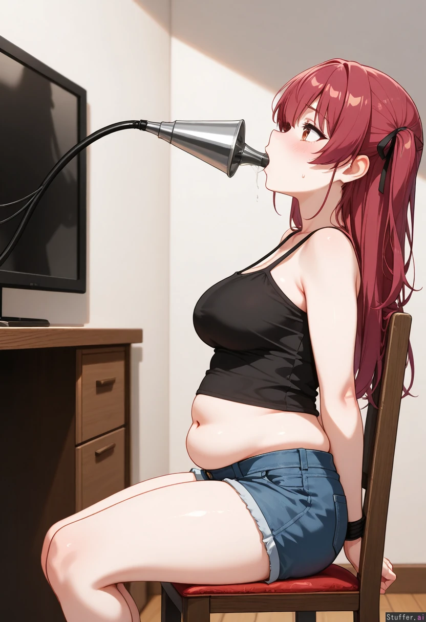 Solo, chubnugget1(artist), perfect proportions, pale skin, houshou_marine(hololive), red shoulder length hair, flirty, (((black top, jean shorts))), living room, sitting on a chair, hands tied behind her back, (black hose in her mouth, funnel feeding, force feeding), (Side view), medium breasts, (Skinny, relaxed: 0.01) (Chubby, nervous, chubby belly: 0.99)