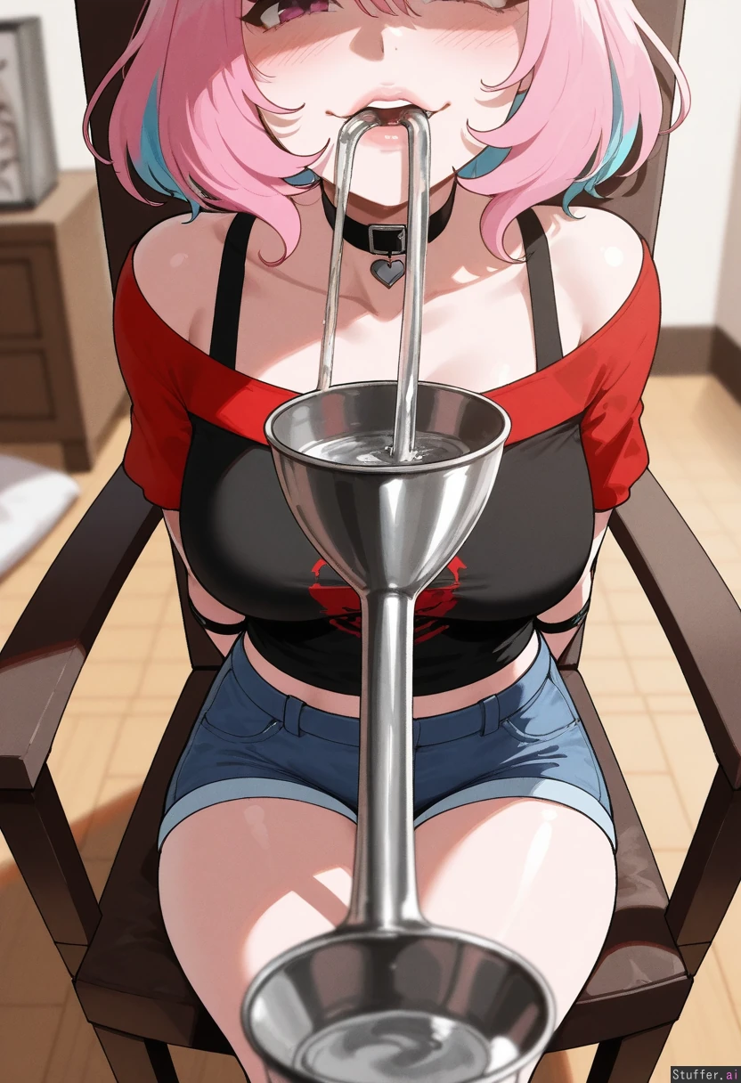 Solo, nyantcha(artist), perfect proportions, pale skin, riamu(idolmaster), red shoulder length hair, flirty, (((black top, jean shorts))), living room, sitting on a chair, hands tied behind her back, (black hose in her mouth, funnel feeding, force feeding), (first person view), medium breasts, (Skinny, relaxed: 0.9) (Chubby, nervous, chubby belly: 0.1)
