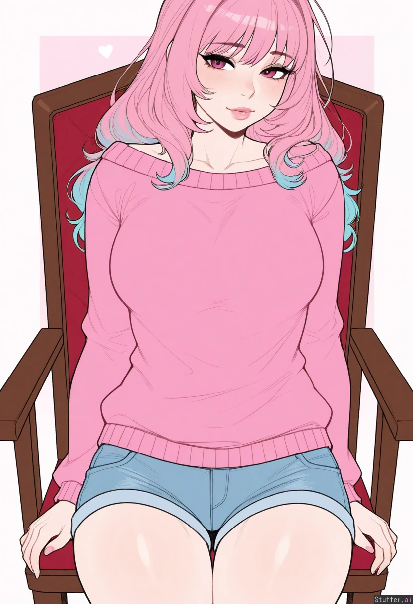 Solo, Krekkov (artist), KAMII MOMORU(artist), (Flat colors), riamu(idolmaster), pale skin, brown wavy hair, shoulder length hair, flirty, (((pink sweater, jean shorts))), Caffe outdors, sitting on a chair, medium breasts, (Skinny, relaxed: 0.9) (Chubby, nervous, chubby belly: 0.1)