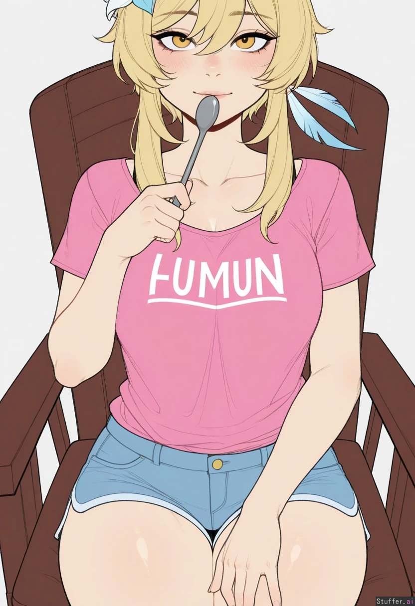 Solo, Krekkov (artist), KAMII MOMORU(artist), (Flat colors), lumine(genshin_impact), pale skin, flirty, comfy pink shirt, jean shorts, medium breasts, sitting in chair, spoon fed, (Skinny, relaxed: 0.7) (Chubby, nervous, chubby belly, undersized clothes, exposed stomach: 0.3)