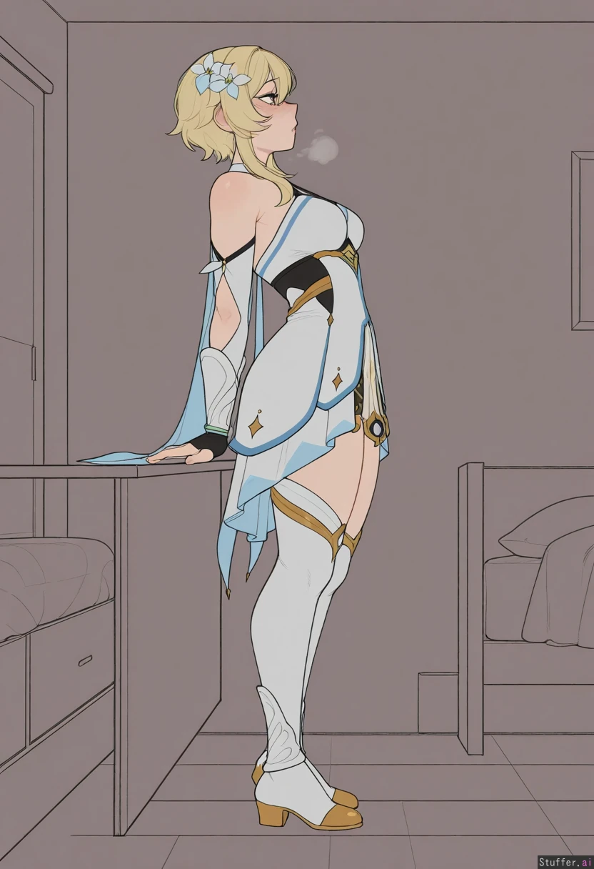 Solo, Krekkov (artist), KAMII MOMORU(artist), (Flat colors), perfect proportions, lumine(genshin_impact), midriff peek, Submissive, leaning back, bedroom, side view, full body,, blush, horny, (big_belly, stuffed_belly, plump, weight gain:0.1)