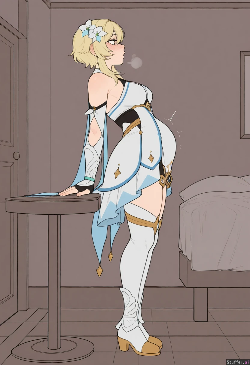 Solo, Krekkov (artist), KAMII MOMORU(artist), (Flat colors), perfect proportions, lumine(genshin_impact), Submissive, leaning back, bedroom, side view, full body,, blush, horny, (big_belly, stuffed_belly, plump, weight gain:0.65)