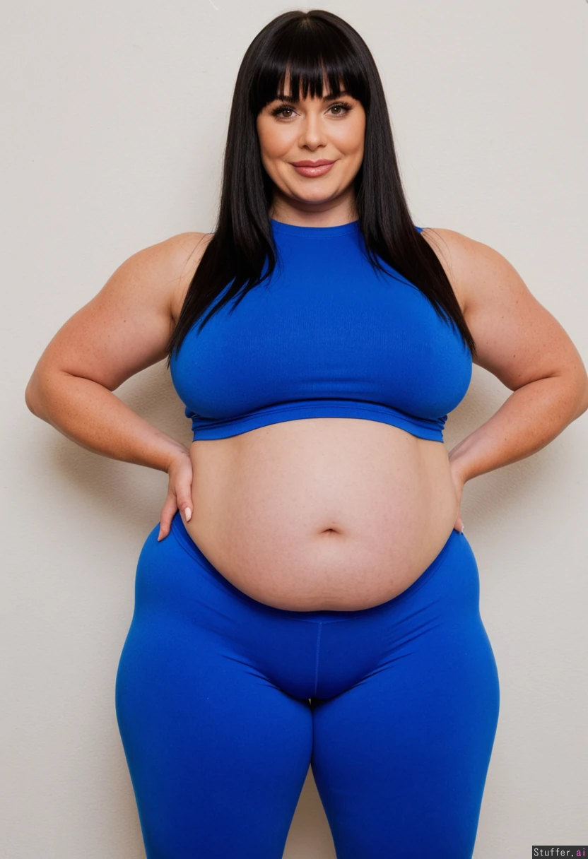 Gorgeous, 40 year old, straight black hair with bangs, (enormous thick wide hips, bloated belly:1.3) Tight blue crop top, high-waisted spandex pants Full body