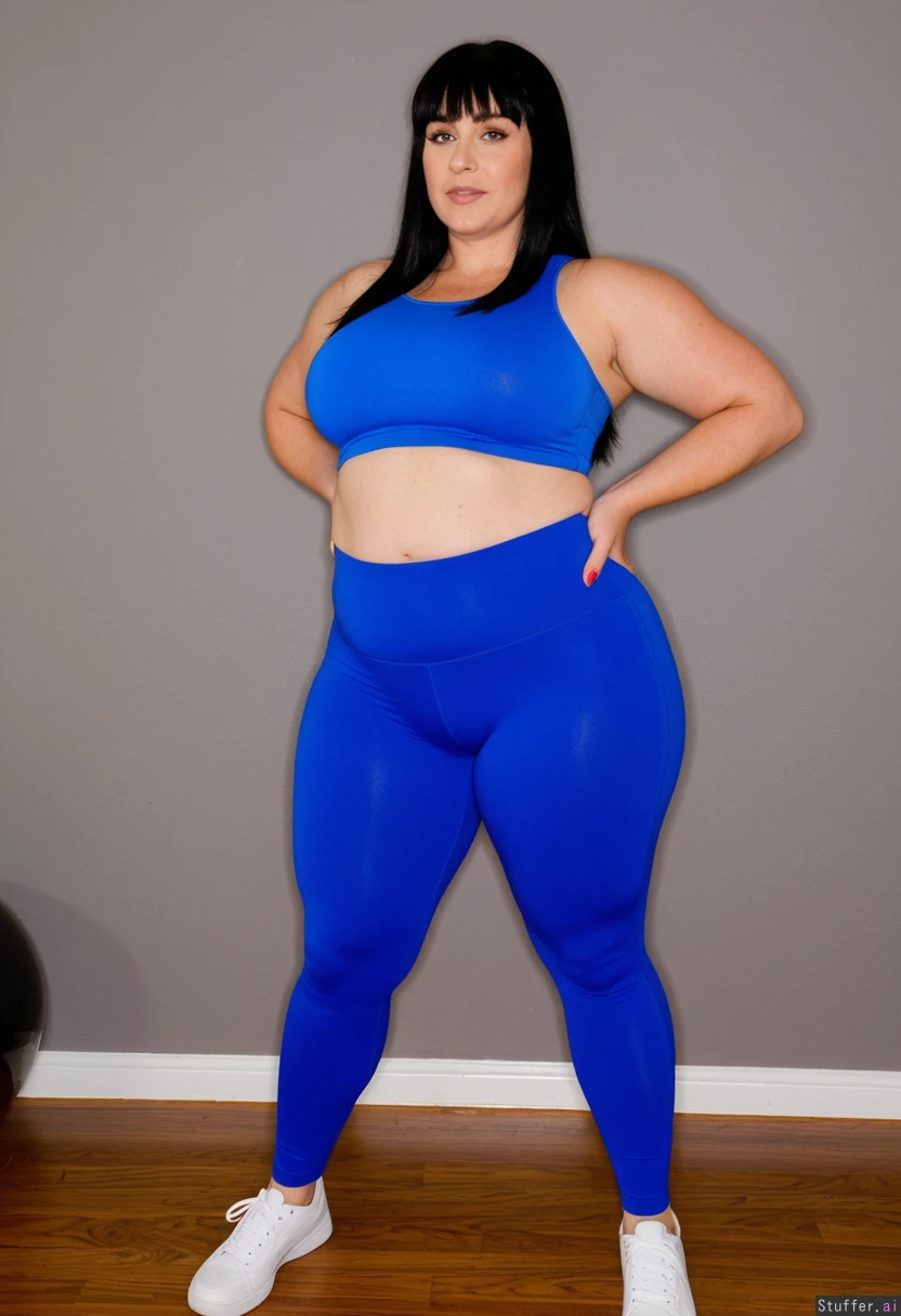 Gorgeous, 40 year old, straight black hair with bangs, (enormous thick wide hips, bloated belly:1.3) Tight blue crop top, (high-waisted spandex pants:1.6) Full body
