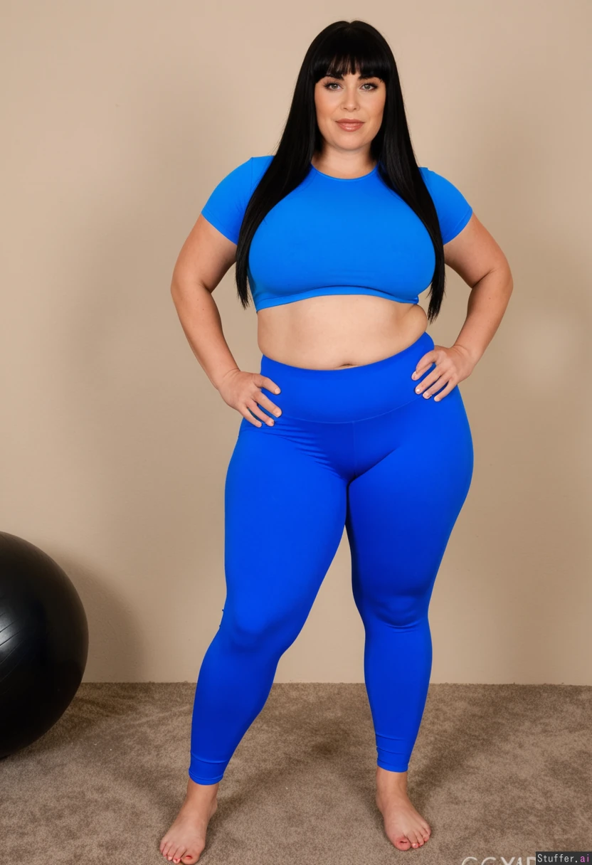 Gorgeous, 40 year old, straight black hair with bangs, (enormous thick wide hips, bloated belly:1.3) Tight blue crop top, (high-waisted spandex pants:1.5) Full body