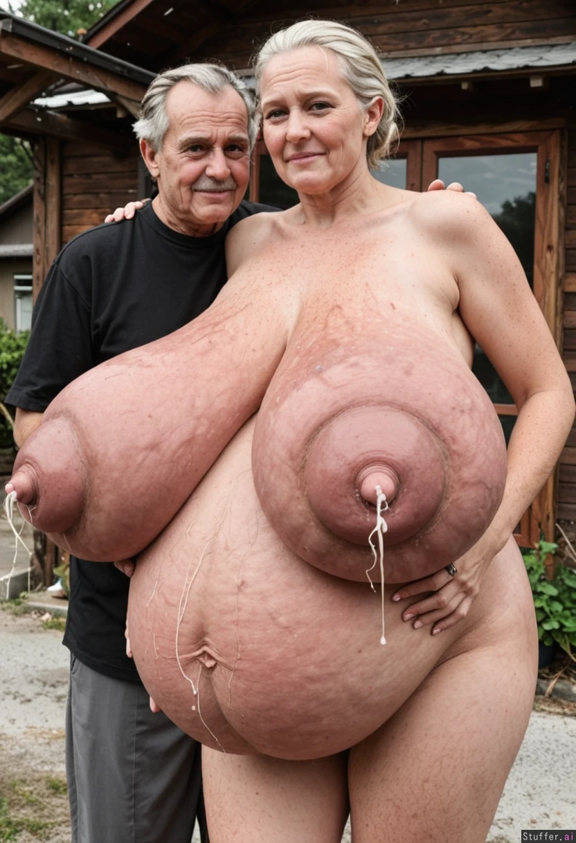 (Enormous tits:3.1), (gigantic nipples:3.4), (platinum blonde hair), (granny:2.1), (village), (pregnant:2.5), (lactating:2.5)