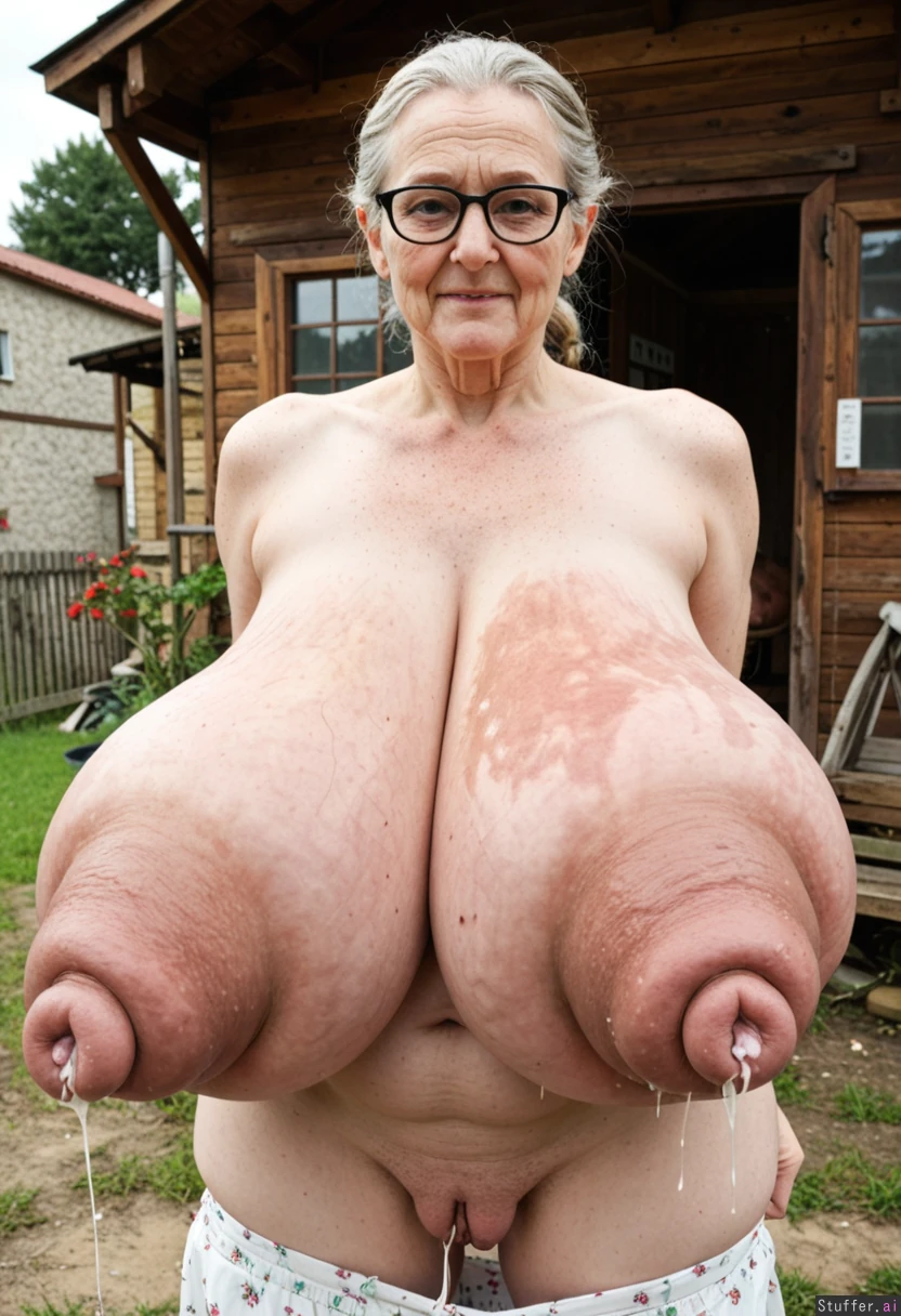 (saggy tits:2.6), (lactating:2.6) (gigantic nipples:2.9), (platinum blonde hair), (granny:2.1), (village)
