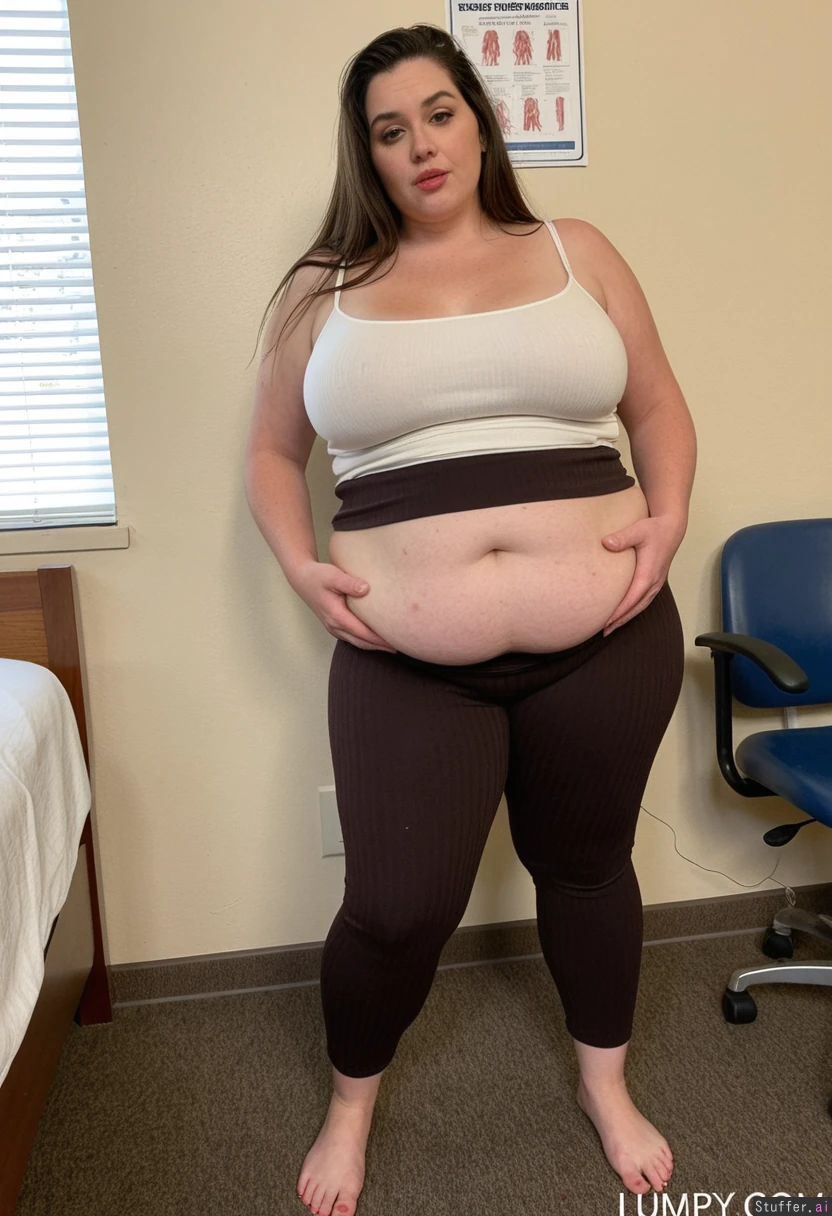 Realistic Fully clothed lazy ugly white housewife wearing ( high waisted mom leggings), ribbed spaghetti strap white top, flannel shirt over spaghetti top,tight clothes, fully clothed lounging in doctors office. Long messy dark brown hair, big lips. Saggy uneven cleavage, saggy, flabby bulging wide hips. Aged doughy soft body, very curvy, soft fat lumpy thighs, squished ass . (Thigh fat and butter fart merge), Clothed dips,(Trying to hide her slightly overgrown fatter love handle flab). (Big knees). ((Skinny:0.9)), Full body view Centered (Body language shows she is not used to being a lazy housewife )
