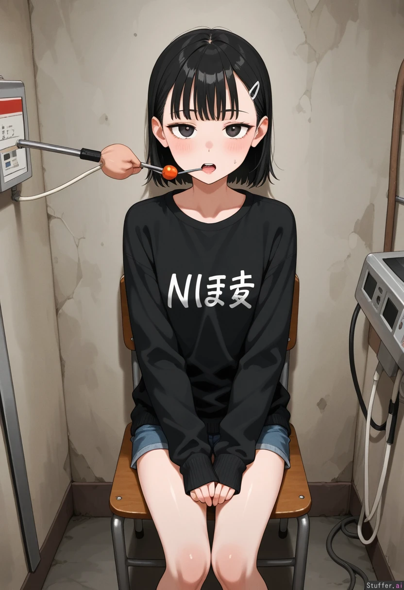 Slim crust punk girl with a distended potbelly and short black hair sitting in a chair in a basement hooked to a feeding machine being operated by Sam from who's the boss