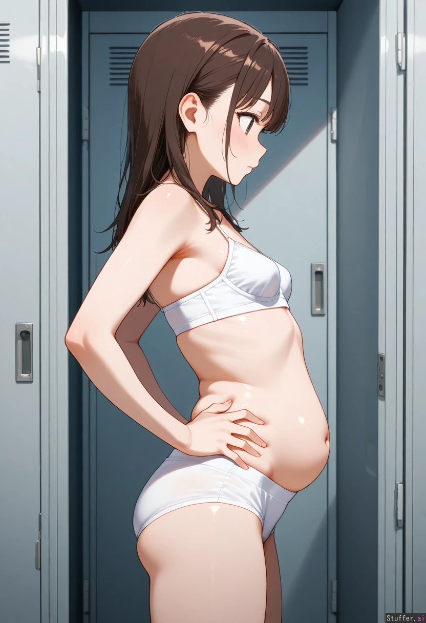 Side view Slim girl in a locker room wearing bra and underpants with a distended belly: 0.000025 hands on hips She has small perky breasts