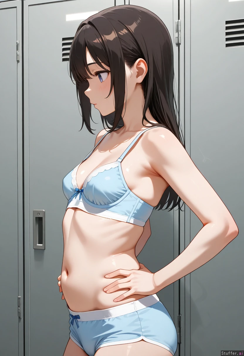 Side view Slim girl in a locker room wearing bra and underpants with a flat six pack belly: 0.000025 hands on hips She has small perky breasts