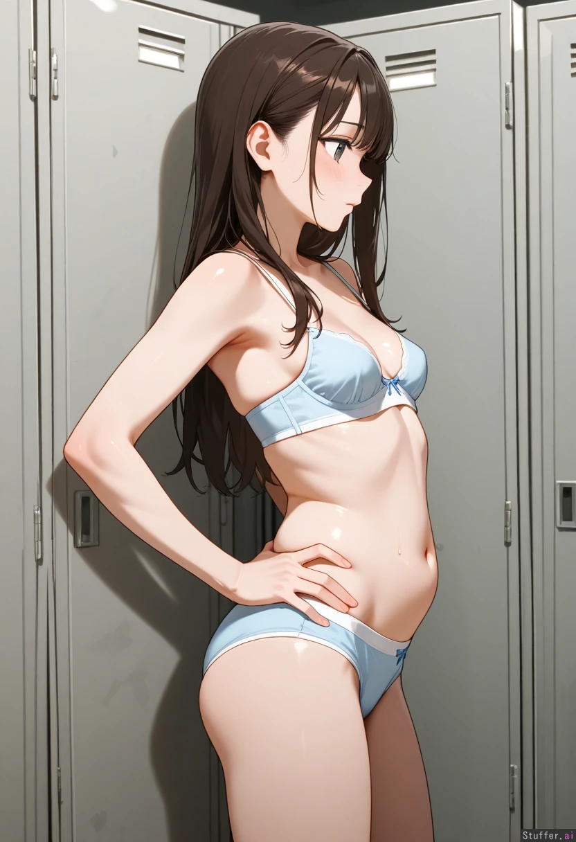 Side view Slim girl in a locker room wearing bra and underpants with a flabby distended belly: 0.25 hands on hips She has small perky breasts