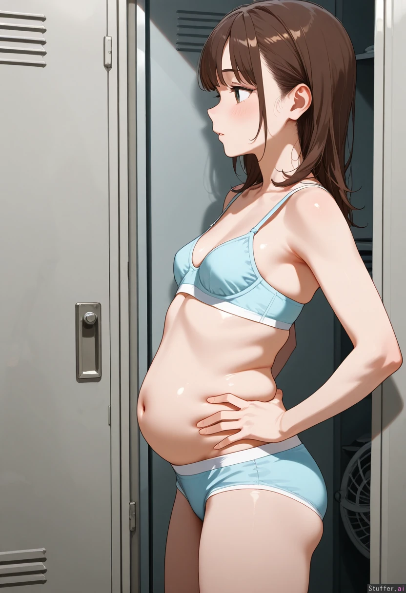 Side view Slim girl in a locker room wearing bra and underpants with a flabby distended belly: 0.75 hands on hips She has small perky breasts