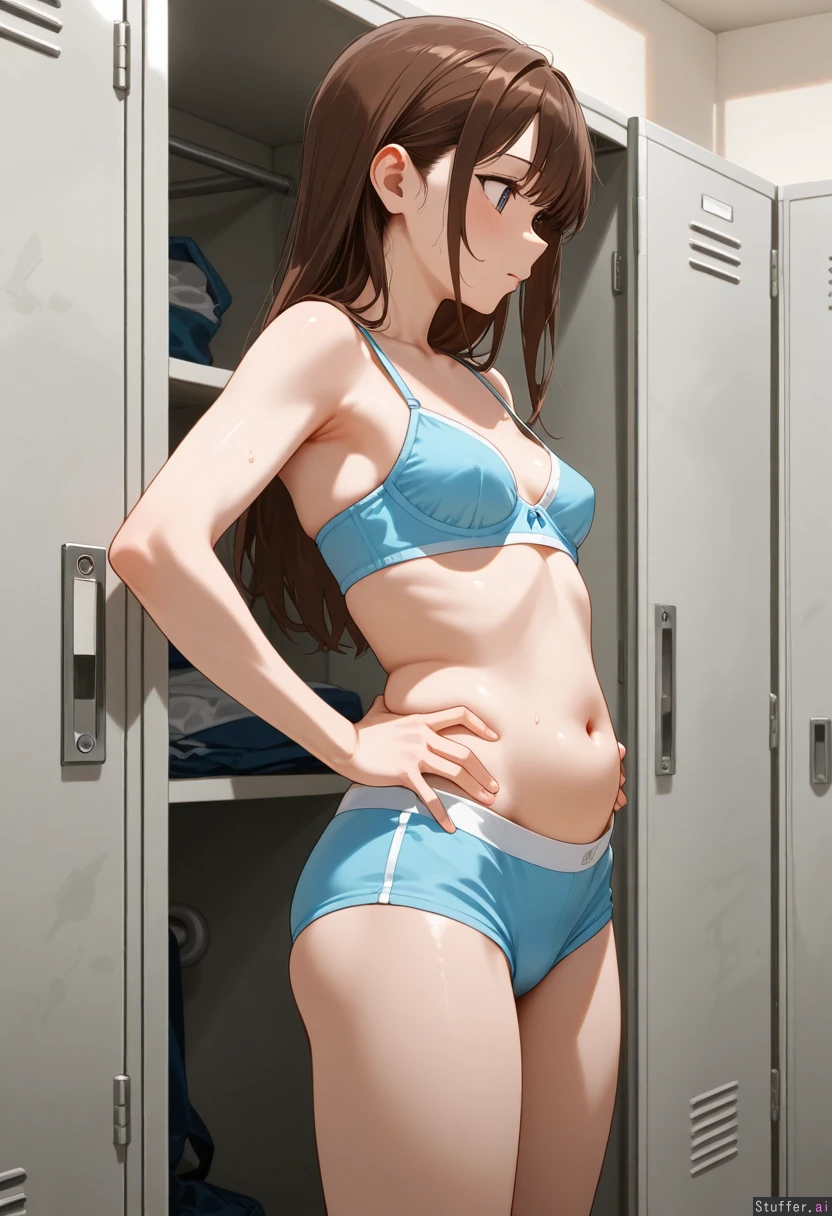 Side view Slim girl in a locker room wearing bra and underpants with a flabby distended belly: 1.75 hands on hips She has small perky breasts