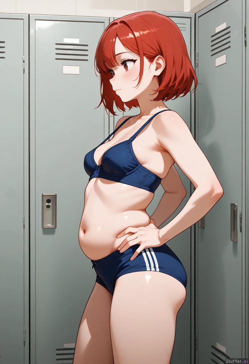 Side view Slim girl in a locker room wearing bra and underpants with a flabby distended belly: 3.25 hands on hips, she asks "should I get fat?" She has small perky breasts