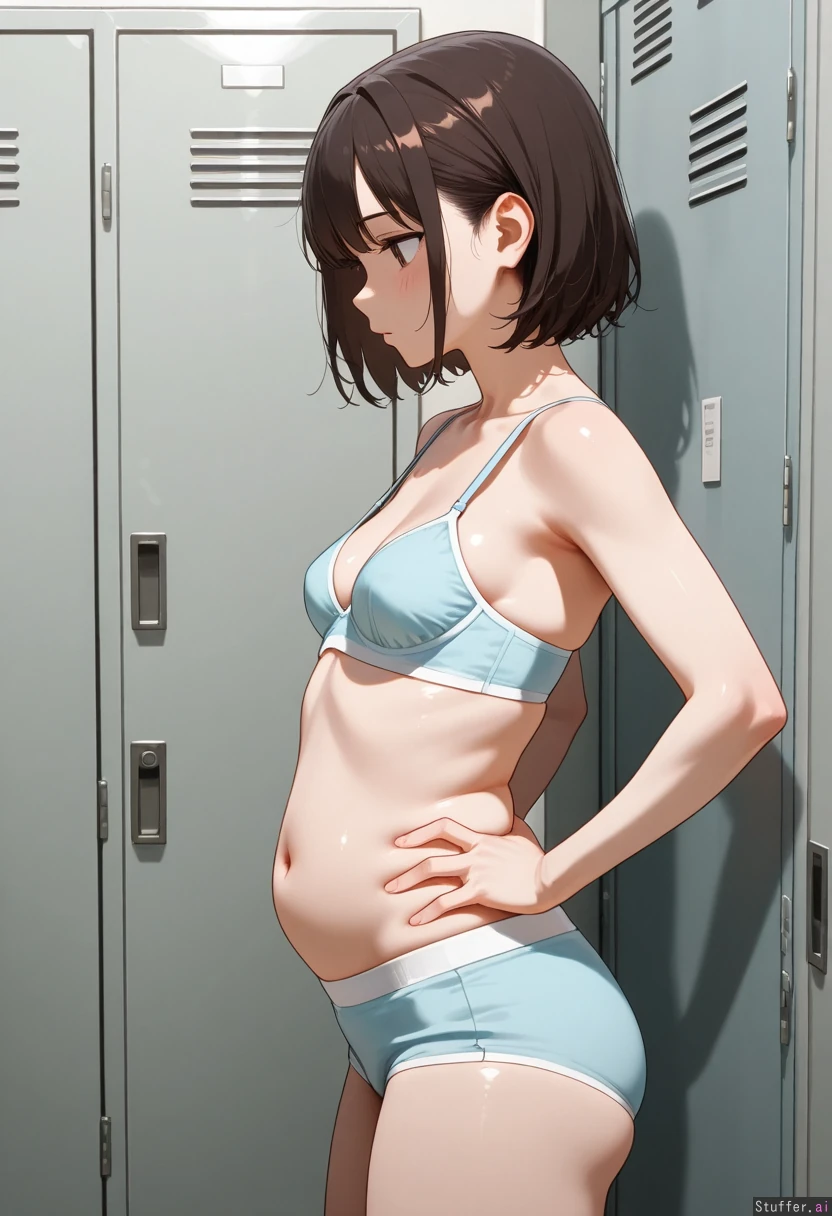 Side view Slim girl in a locker room wearing bra and underpants with a flabby distended belly: 4.25 hands on hips, she asks "should I get fat?" She has small perky breasts