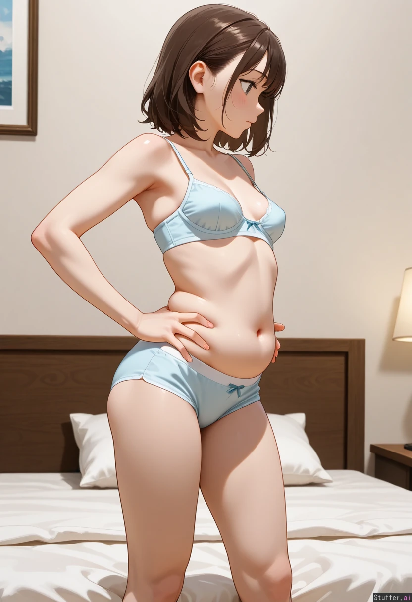 Side view Slim brunette girl on her knees in bed wearing bra and underpants with a flabby belly: 1.25 hands on hips, she asks "should I get fat?" She has small perky breasts