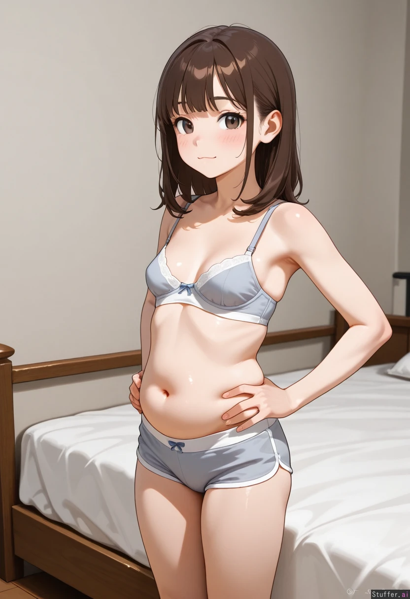 Side view Slim brunette girl on her knees in bed wearing bra and underpants with a flabby belly: 3.25 hands on hips, she asks "should I get fat?" She has small perky breasts