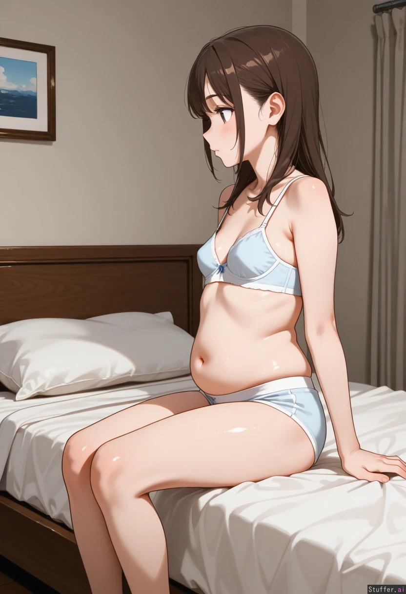 Side view Slim brunette girl on her knees in bed wearing bra and underpants with a flabby belly: 6.25, she asks "do you think I am fat yet?" She has small perky breasts