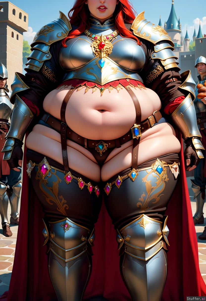 fantasy realism. outdoors, in front of castle. tall confident warrior. Her ornate metal armor is lined with precious gems but is too small and covers only her arms and upper chest. bottom half of large fat belly and fat rolls exposed. she wears baggy leather pants with royal patterns under plated armor on her knees and legs. large belt holds her pants up. tight straps squeeze her fat thighs. rare gems embedded into armor. ornate necklace. gorgeous face, long red hair, low golden crown. very fat. beautiful teeth. out of shape, gained weight. eating turkey leg. escorted by skinny royal guards. In background a Commoners looks on with interest.