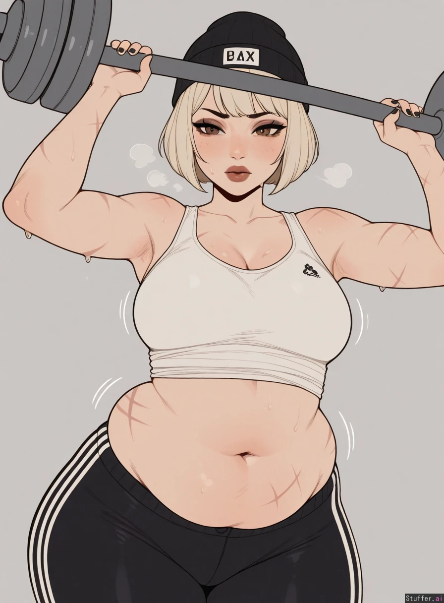 KAMII MOMORU(artist), kipteitei(artist), ((Flat color, simple shading)), (cold_lighting), motion lines jiggle (Short platinum blonde bob cut hair, light skin, brown lipstick, dark eyeshadow, scars on body, white_nail_polish, goldem brown eyes) (gym outfit, (tight white tank top belly hanging out, deep navel), black beanie, tight black dress pants, outgrown clothes, pants unbuttoned, too fat for clothes) (Curvy, getting fat, busty), fat soft thighs, (plump hips), (Perfect 2d art)), (((huge_full_belly))), painfully_full ((tired expression, (beautiful detailed face)), (lifting two small dumbells, sweating, heavy breathing, furrowed eyebrows)