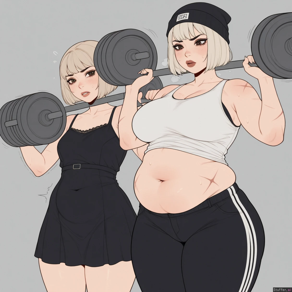 KAMII MOMORU(artist), kipteitei(artist), ((Flat color, simple shading)), (cold_lighting), motion lines jiggle (Short platinum blonde bob cut hair, light skin, brown lipstick, dark eyeshadow, scars on body, white_nail_polish, goldem brown eyes) (gym outfit, (tight white tank top belly hanging out, deep navel), black beanie, tight black dress pants, outgrown clothes, pants unbuttoned, too fat for clothes) (Curvy, getting fat, busty), fat soft thighs, (plump hips), (Perfect 2d art)), (((huge_full_belly))), painfully_full ((tired expression, (beautiful detailed face)), (lifting two small dumbells, sweating, heavy breathing, furrowed eyebrows)