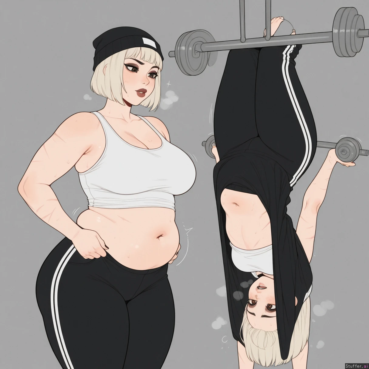 KAMII MOMORU(artist), kipteitei(artist), ((Flat color, simple shading)), (cold_lighting), motion lines jiggle (Short platinum blonde bob cut hair, light skin, brown lipstick, dark eyeshadow, scars on body, white_nail_polish, goldem brown eyes) (gym outfit, (tight white tank top belly hanging out, deep navel), black beanie, tight black dress pants, outgrown clothes, pants unbuttoned, too fat for clothes) (Curvy, getting fat, busty), fat soft thighs, (plump hips), (Perfect 2d art)), (((huge_full_belly))), painfully_full ((tired expression, (beautiful detailed face)), (lifting two small dumbells, sweating, heavy breathing, furrowed eyebrows)