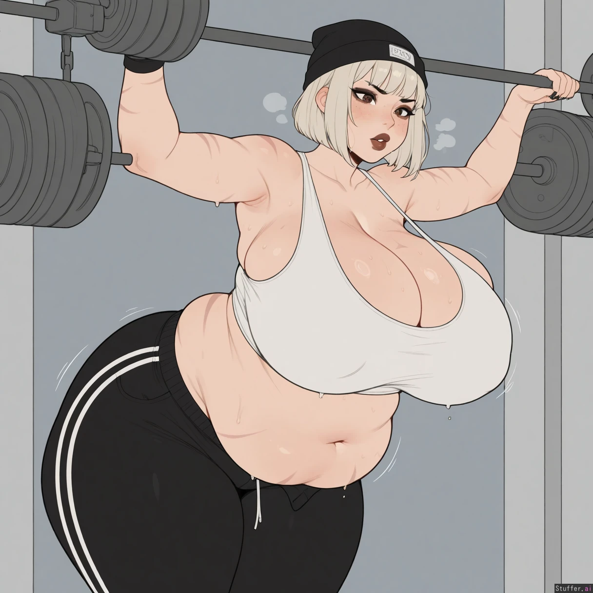 KAMII MOMORU(artist), kipteitei(artist), ((Flat color, simple shading)), (cold_lighting), motion lines jiggle (Short platinum blonde bob cut hair, light skin, brown lipstick, dark eyeshadow, scars on body, white_nail_polish, goldem brown eyes) (gym outfit, (tight white tank top belly hanging out, deep navel), black beanie, tight black dress pants, outgrown clothes, pants unbuttoned, too fat for clothes) (Curvy, getting fat, busty), fat soft thighs, (plump hips), (Perfect 2d art)), (((gigantic huge_full_belly))), painfully_full ((tired expression, (beautiful detailed face)), (lifting two small dumbells, sweating, heavy breathing, furrowed eyebrows)
