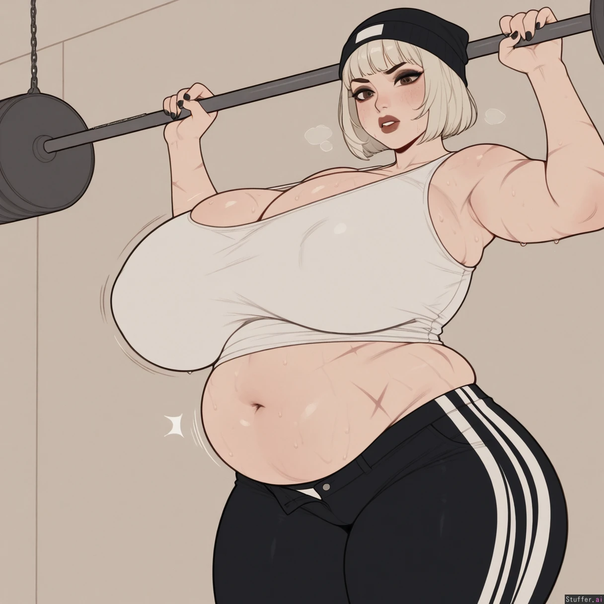 KAMII MOMORU(artist), kipteitei(artist), ((Flat color, simple shading)), (cold_lighting), motion lines jiggle (Short platinum blonde bob cut hair, light skin, brown lipstick, dark eyeshadow, scars on body, white_nail_polish, goldem brown eyes) (gym outfit, (tight white tank top belly hanging out, deep navel), black beanie, tight black dress pants, outgrown clothes, pants unbuttoned, too fat for clothes) (Curvy, getting fat, busty), fat soft thighs, (plump hips), (Perfect 2d art)), (((gigantic huge_full_belly 1))), painfully_full ((tired expression, (beautiful detailed face)), (lifting two small dumbells, sweating, heavy breathing, furrowed eyebrows)